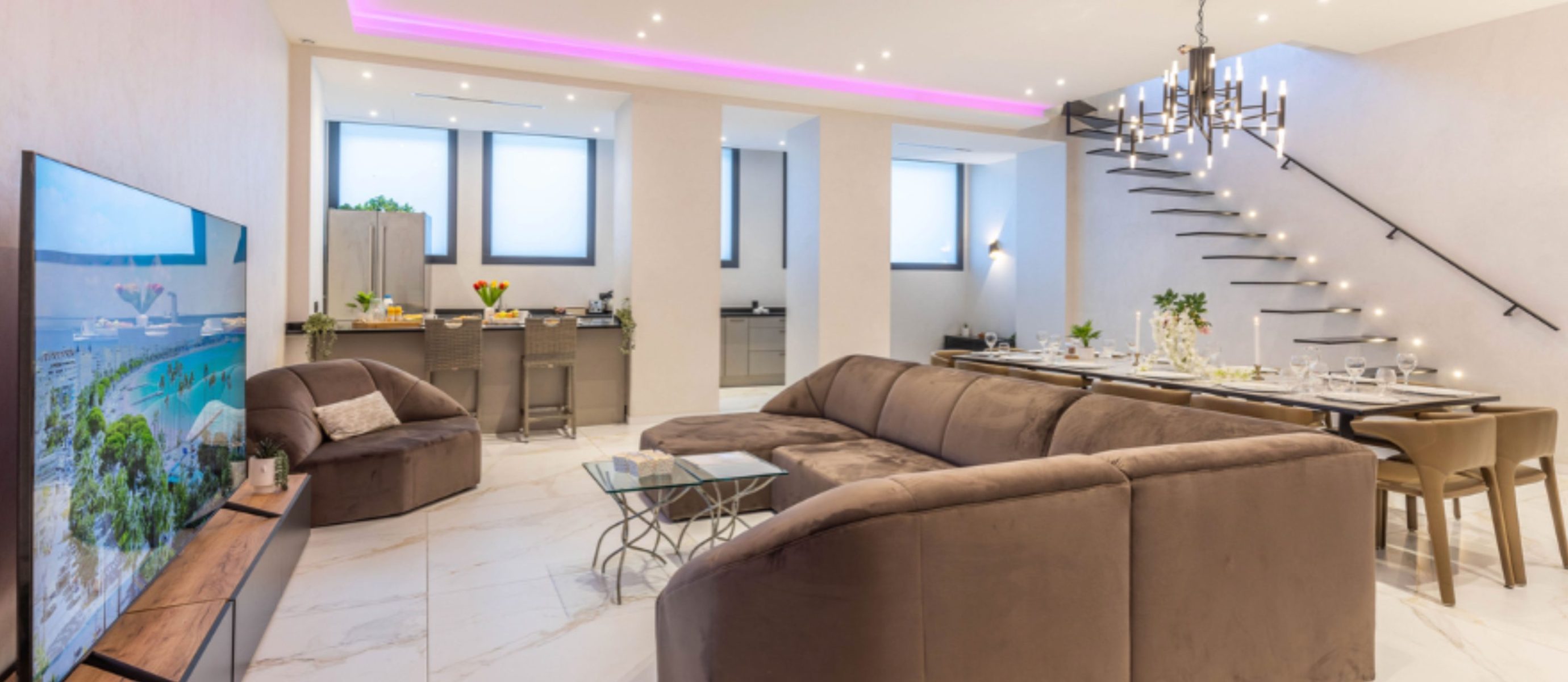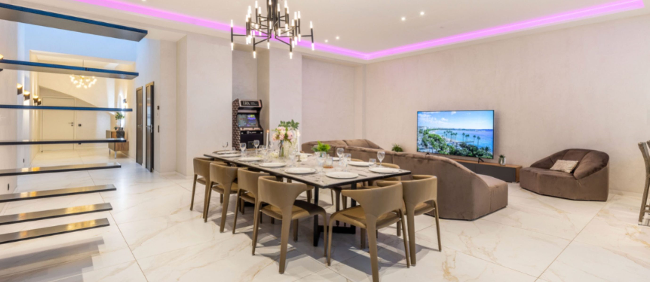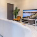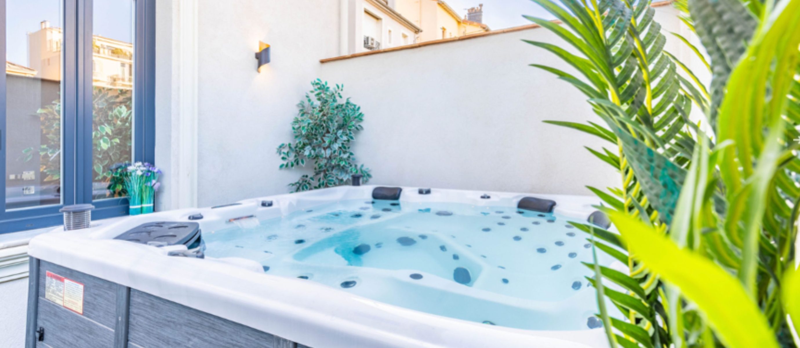 Each of the six bedrooms is arranged with two single beds, providing flexible sleeping options. The bright open-plan living area includes a fully equipped kitchen and generous space for socialising, while the large terrace features a summer kitchen, jacuzzi and sauna, creating an exceptional outdoor living area in the city centre. Additional comforts include air conditioning, Wi-Fi, multiple TVs and nearby covered parking, combining space, privacy and premium amenities for a refined Cannes stay.
