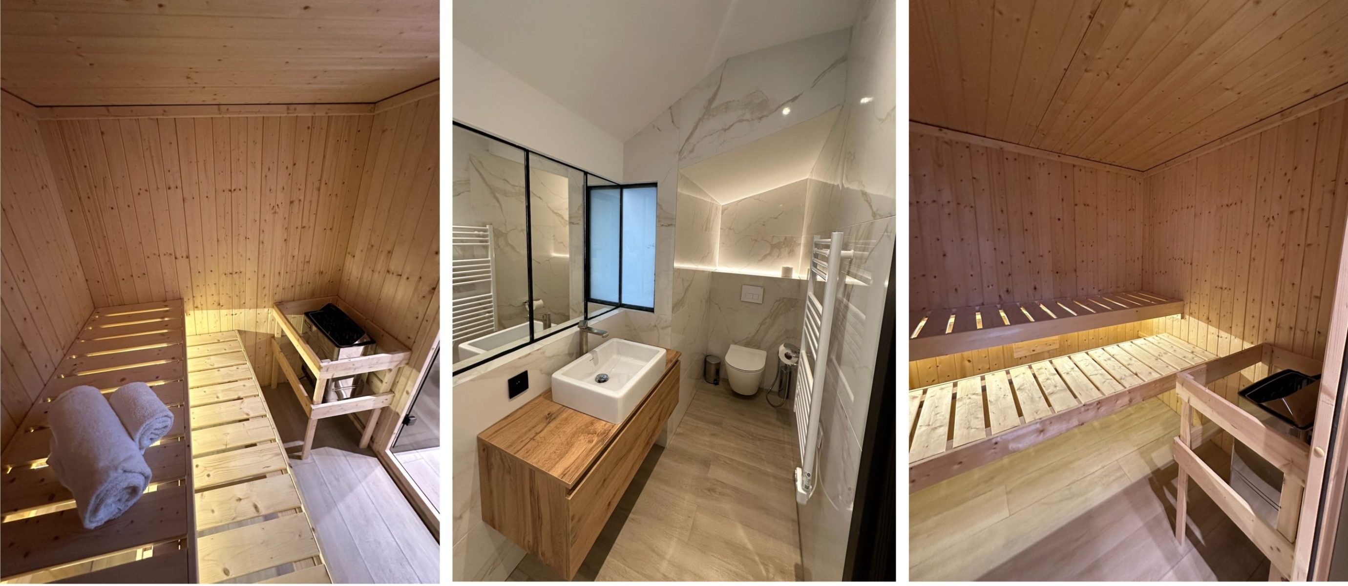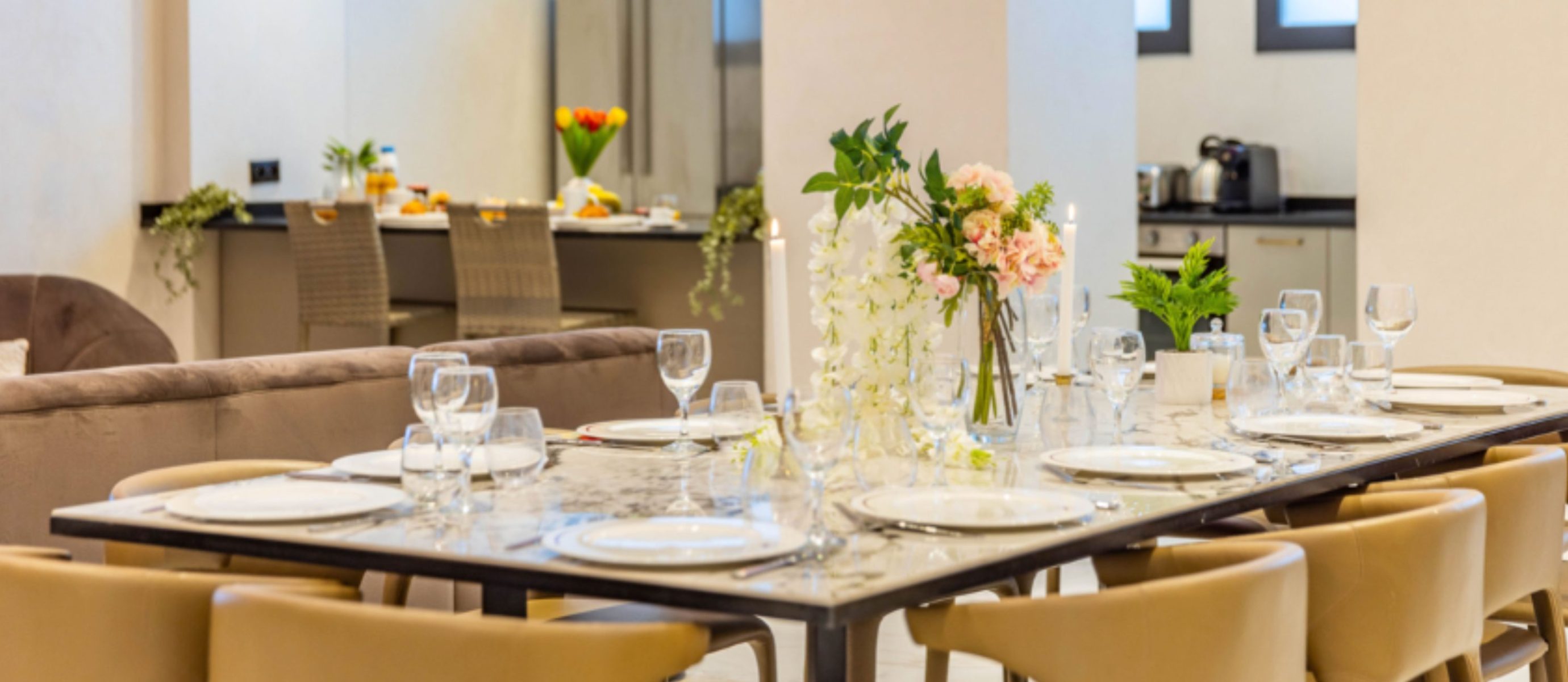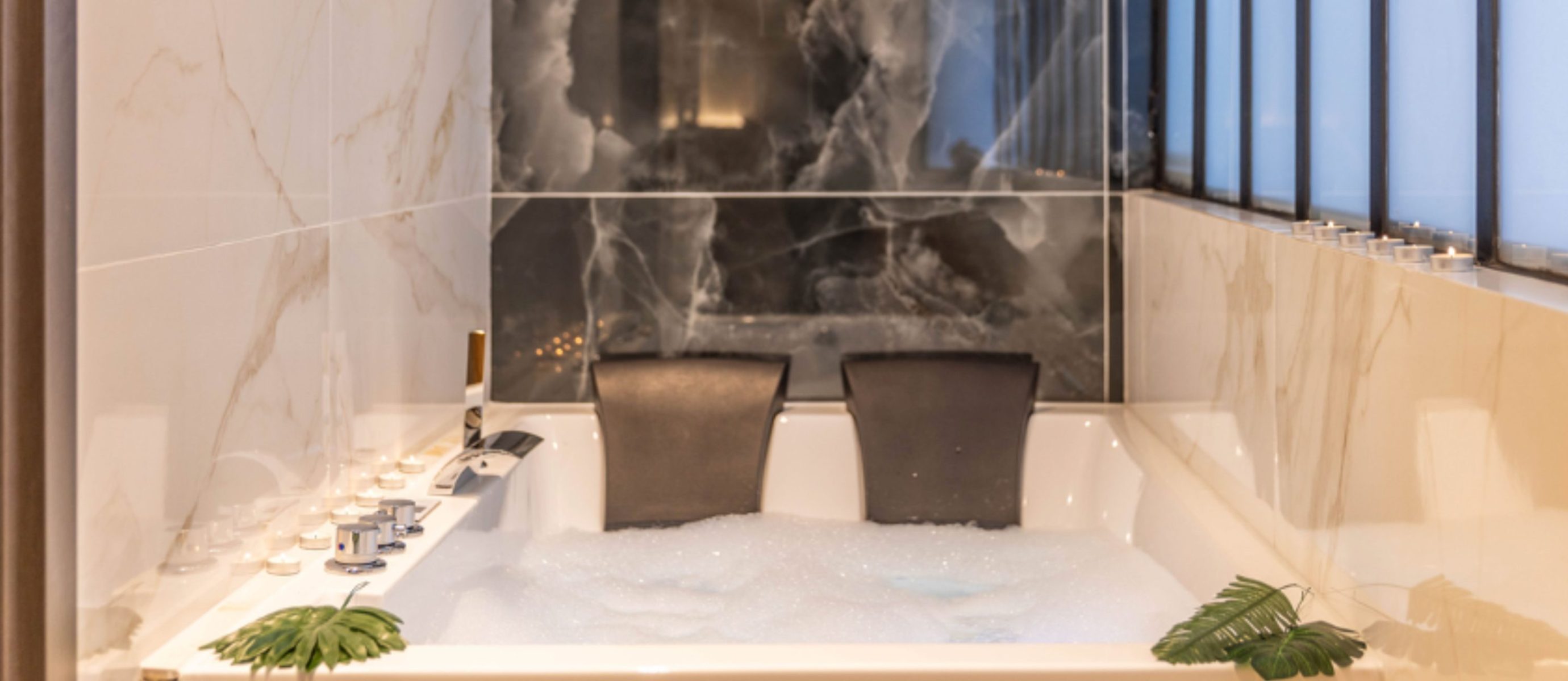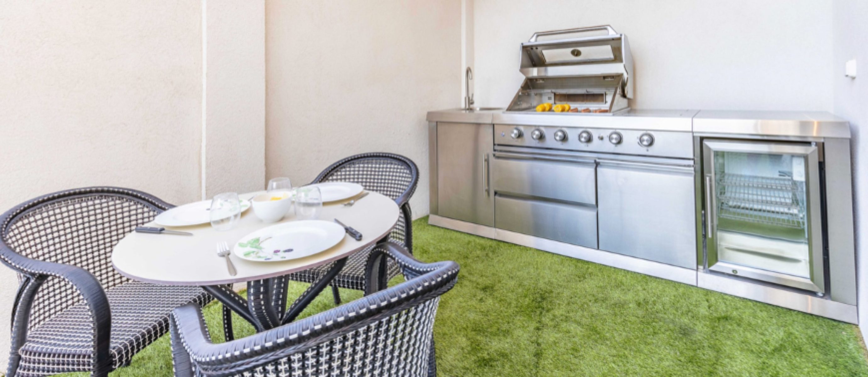 Each of the six bedrooms is arranged with two single beds, providing flexible sleeping options. The bright open-plan living area includes a fully equipped kitchen and generous space for socialising, while the large terrace features a summer kitchen, jacuzzi and sauna, creating an exceptional outdoor living area in the city centre. Additional comforts include air conditioning, Wi-Fi, multiple TVs and nearby covered parking, combining space, privacy and premium amenities for a refined Cannes stay.